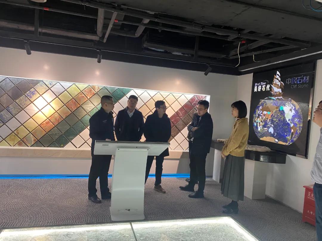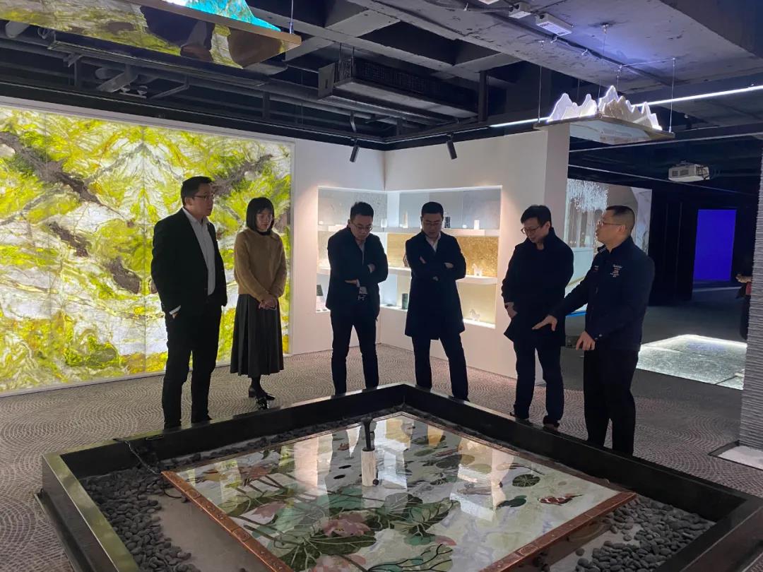 中民團(tuán)隊(duì)陪同海石薈董事長(zhǎng)林忠毅、總經(jīng)理劉剛一行先后參觀了中民石材產(chǎn)業(yè)集團(tuán)沉浸式智能展廳、石材文化系列展示、海景創(chuàng)客設(shè)計(jì)師共享空間等。